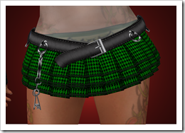 This whole epiphany started when my good friend over at Wicked Gear dropped a dare in my inventory. A dare? You ask… well, she dropped the new “Only for the brave” skirt fat pack on me and I said…”fudawwha!?” yeah, that’s not English. Anyway, I tried on the skirt, and while I don’t normally wear these short little sassy things that make your butt hang out and give you a high pitched giggle… I couldn’t resist the darned thing. It was amazingly cute! The little key hanging off the belt was awesome. The textures are fantastic!